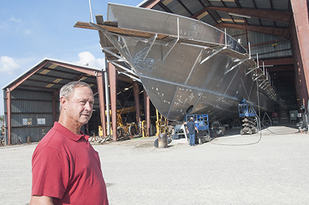 October, 2013 photo of Kerry Neuville with the first 180-footer at the yard in New Iberia,